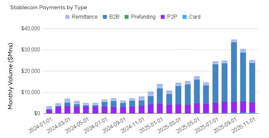 The report estimates that whole annual stablecoin funds soared to $390 billion, greater than double 2024 ranges, with B2B transactions accounting for roughly 60% of the entire.