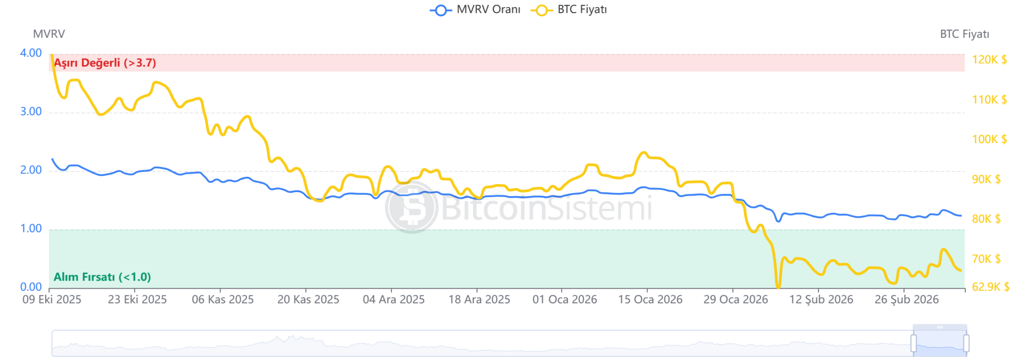 A graph exhibiting the change within the MVRV metric relative to the Bitcoin value.