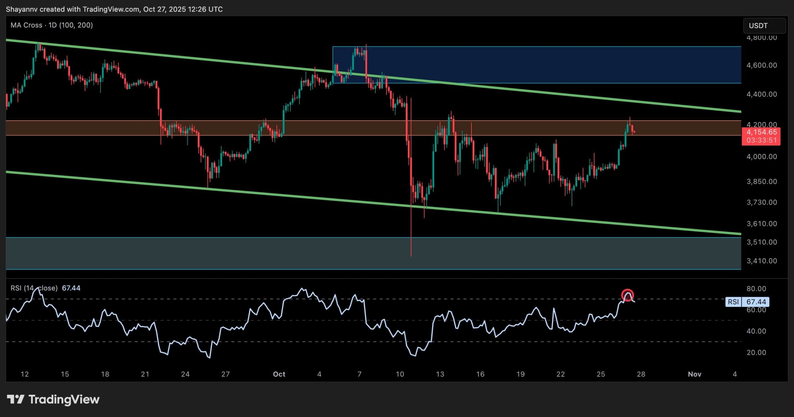Ethereum is exhibiting indicators of power once more because it makes an attempt to reclaim key resistance ranges after a pointy early-October drop. The bounce from the decrease boundary of the descending channel has introduced it again towards $4,150. Momentum is constructing, however the market stays cautious forward of key resistance ranges.