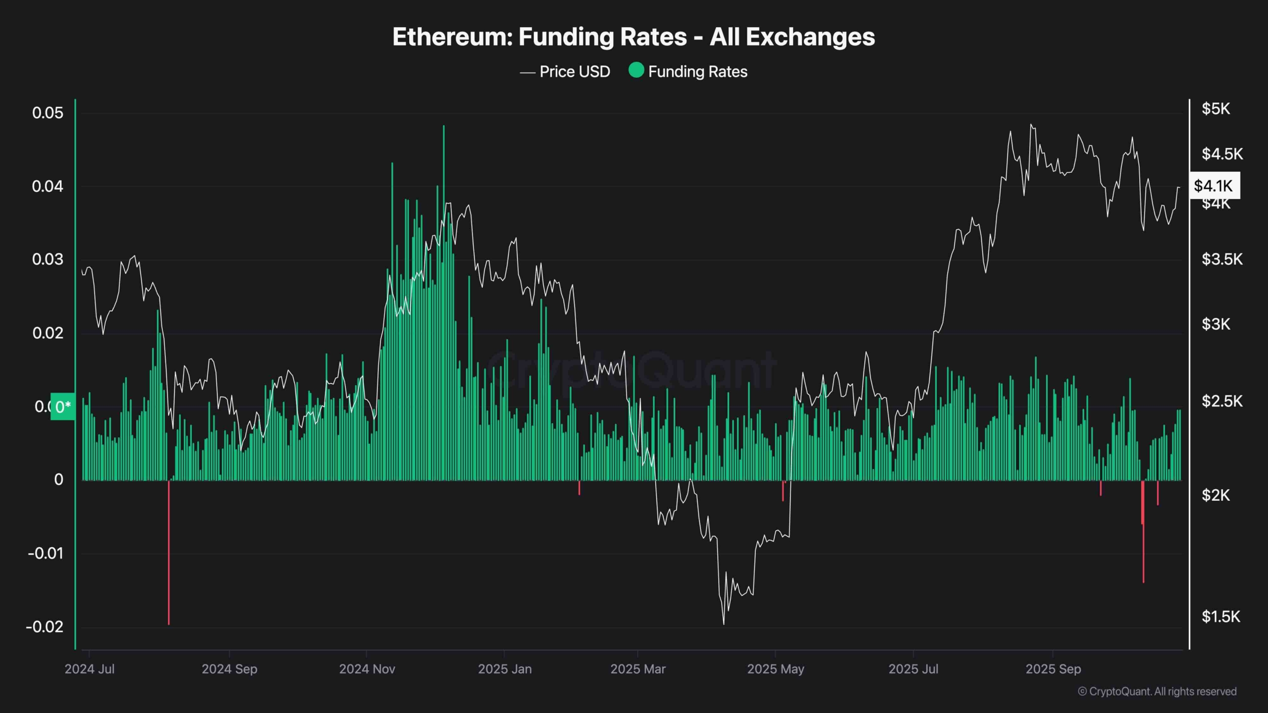 Sentiment throughout the Ethereum futures market is exhibiting indicators of rising optimism, however it has not but reached a harmful degree. Funding charges have turned persistently constructive after some important unfavorable prints, particularly throughout the September and early October dip.