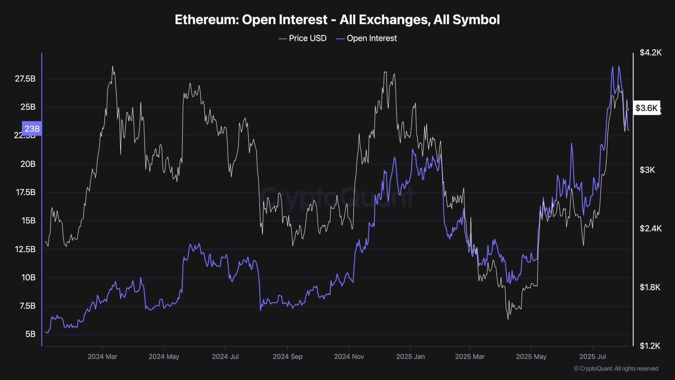 Open Curiosity has began ticking decrease after peaking close to $28B simply as ETH reached $3,800. This slight drop in OI throughout consolidation suggests some lengthy positions have been closed or liquidated. Nonetheless, the broader pattern continues to be clearly upward, with open curiosity doubling since Might.