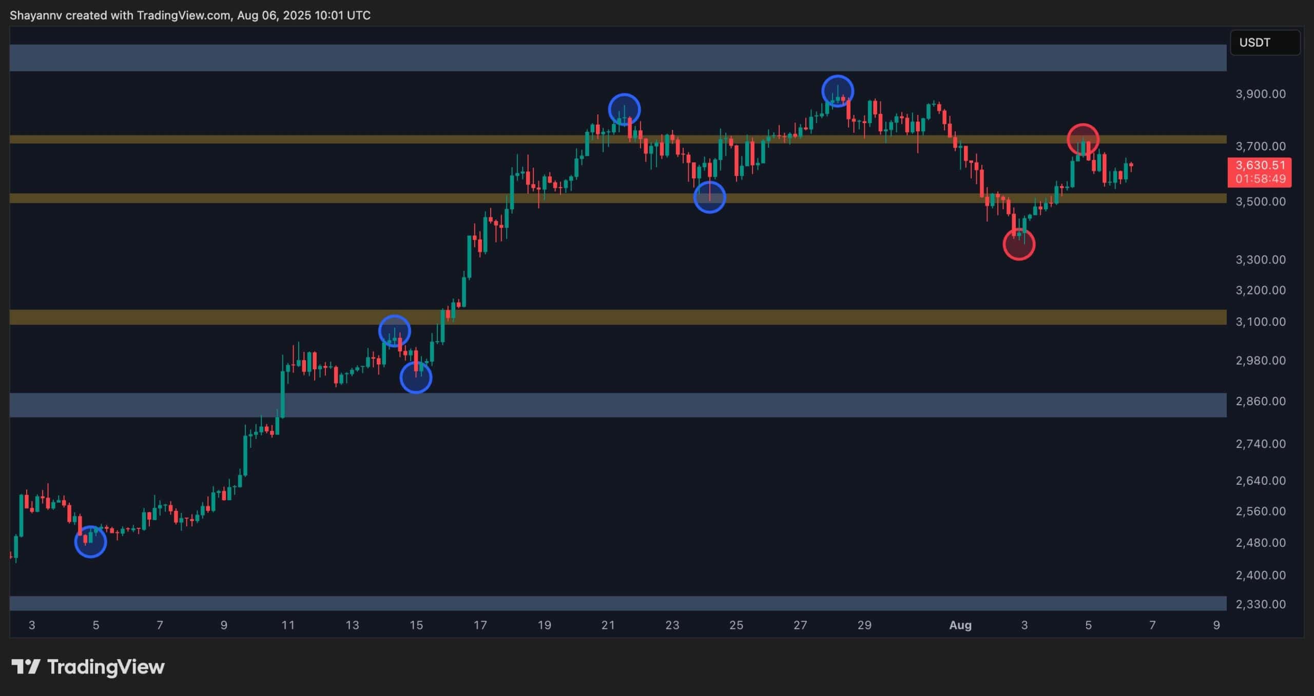 But, for now, ETH is respecting the native demand zone at $3,500. So long as this degree holds, short-term bias stays impartial to bullish. A break beneath $3,500, nevertheless, might entice sellers and set off a transfer towards $3,300 and even decrease. However, reclaiming $3,700 and holding above it will open the door towards $3,900 and presumably $4,100.