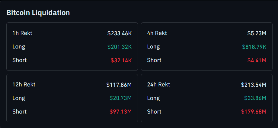 Zooming out, shorts take the hit in an enormous means over the past 4 hours, with $4.41M wiped versus $818.79K in longs. Over the past 12 hours, $97.13M in shorts had been liquidated in contrast with $20.73M in longs. Over the past 24 hours, quick liquidations reached $179.68M versus $33.86M in lengthy liquidations.