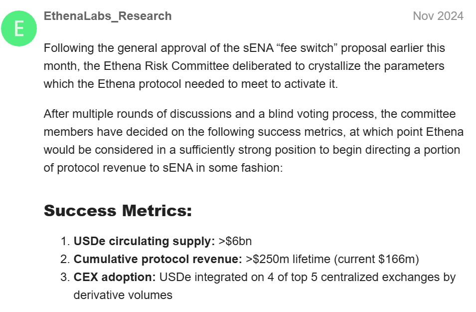 Ethena Labs proposed “success metrics” for activating the price change, however no activation date has been introduced. Supply: Ethena Basis